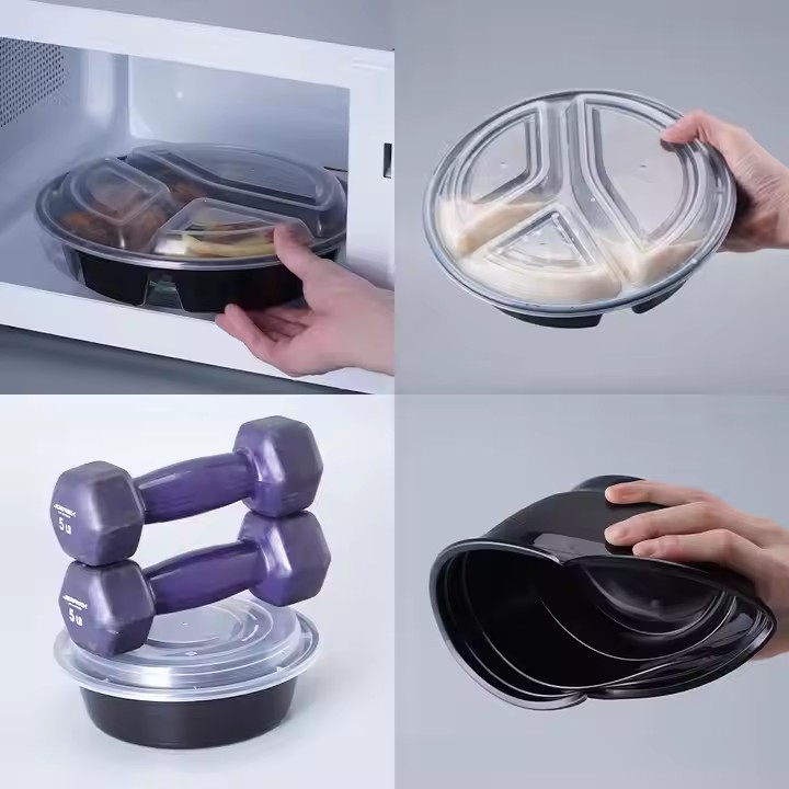 Cheap Packing Plastic Box Food Microwavable Disposable Hinged Clamshell 3-compartment Shallow Food Container